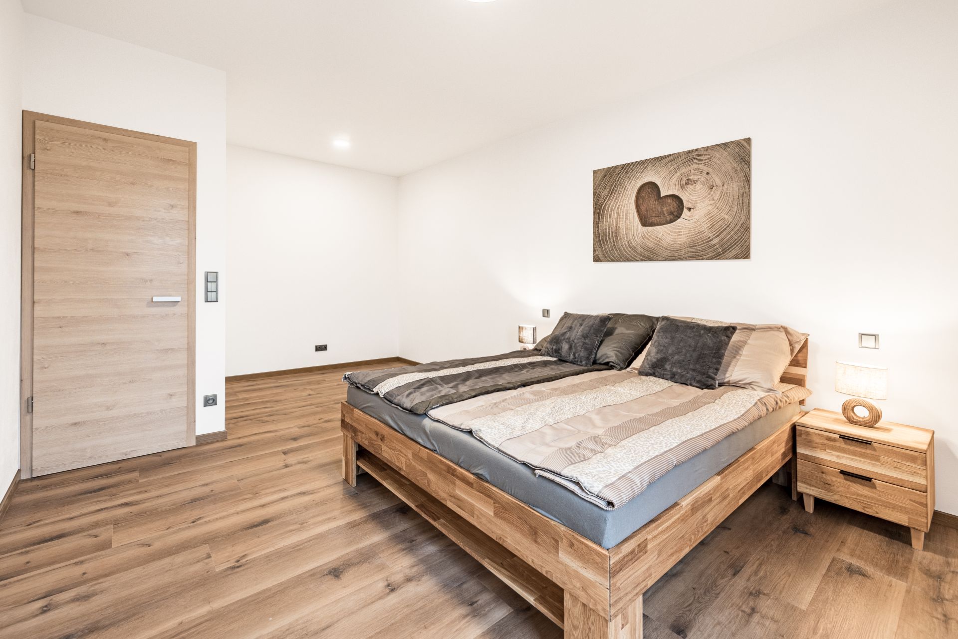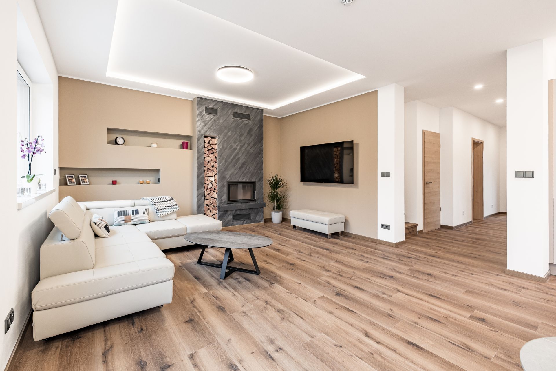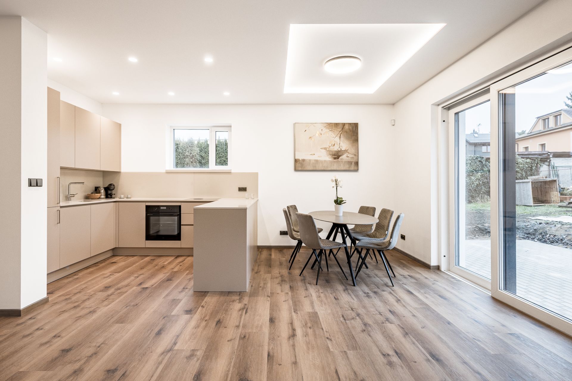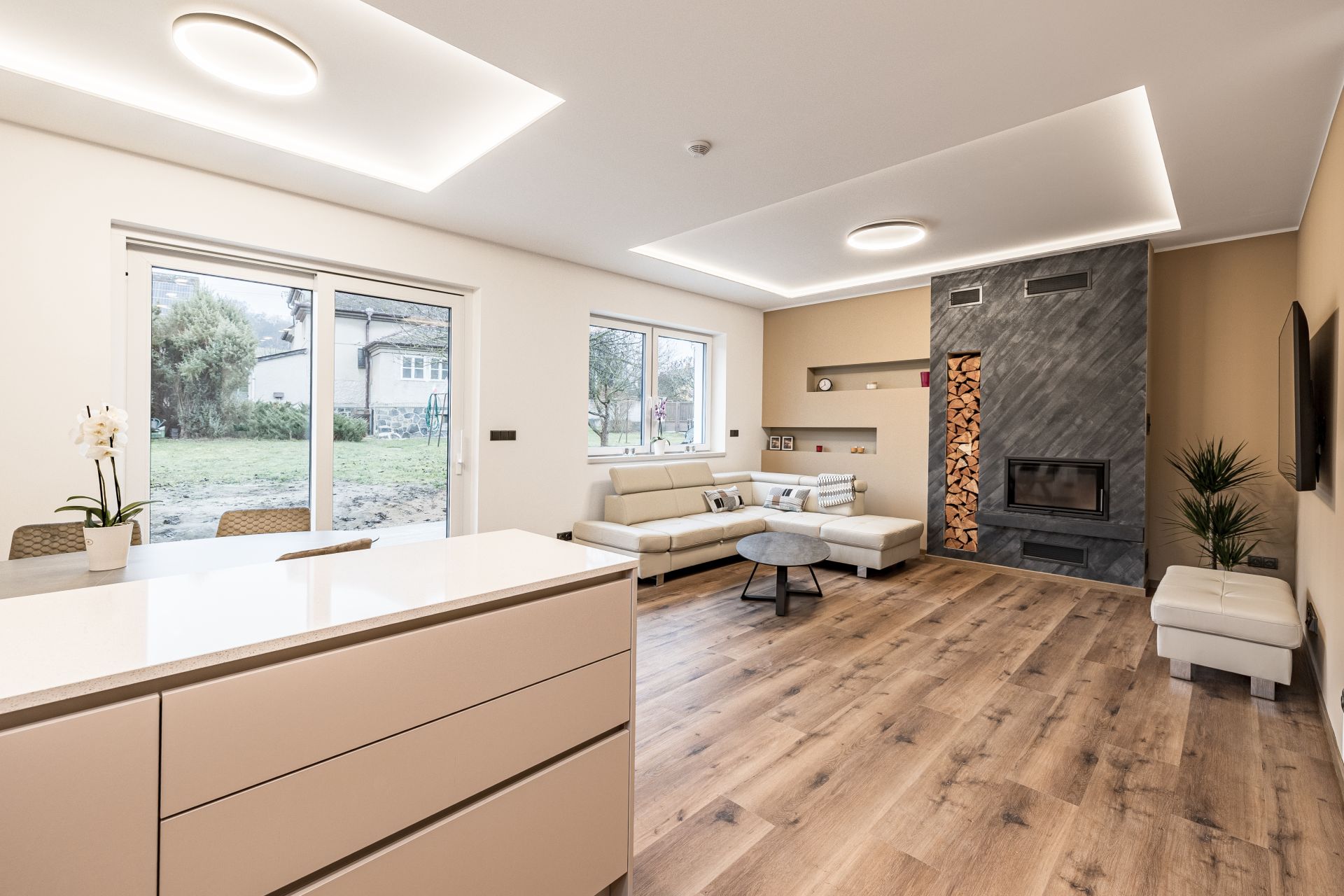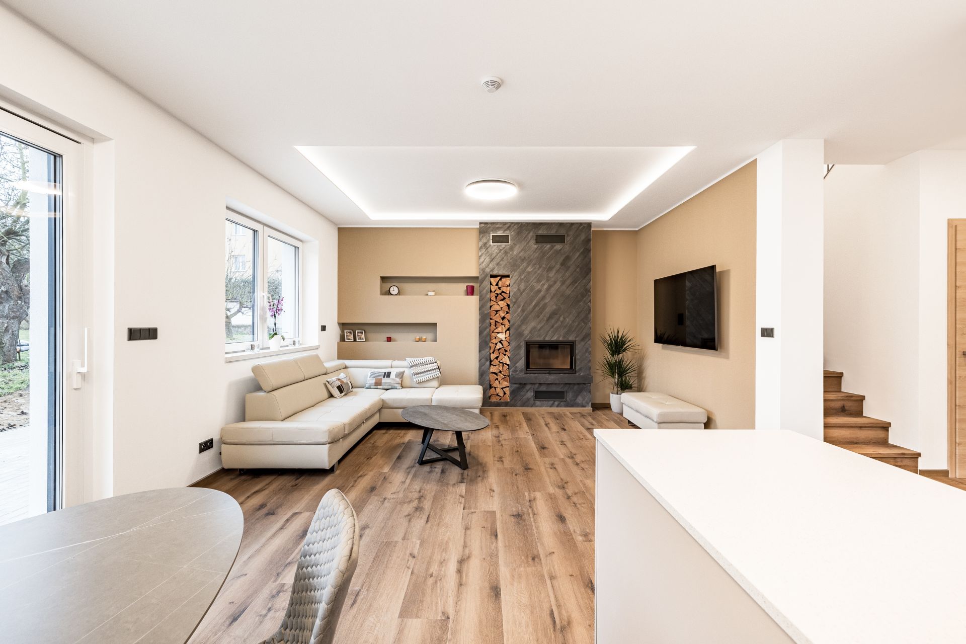 Po vstupu do zádveří můžete vstoupit do šatny, dále z chodby technické místnosti, koupelny se sprochovým koutem a wc nebo do srdce domu v podobě prostorného obývacího pokoje s kuchyňským koutem. Pro vzdušnost a světlost prostoru navrhl architekt francouzské okno se vstupem do zahrady, které přírodním světlem osvětluje obývací pokoj. V 1. NP se dále nachází garáž s průchodem do domu. Ve 2. NP se nachází čtyři pokoje a prostorná koupelna s wc.