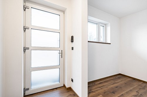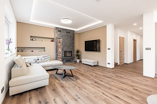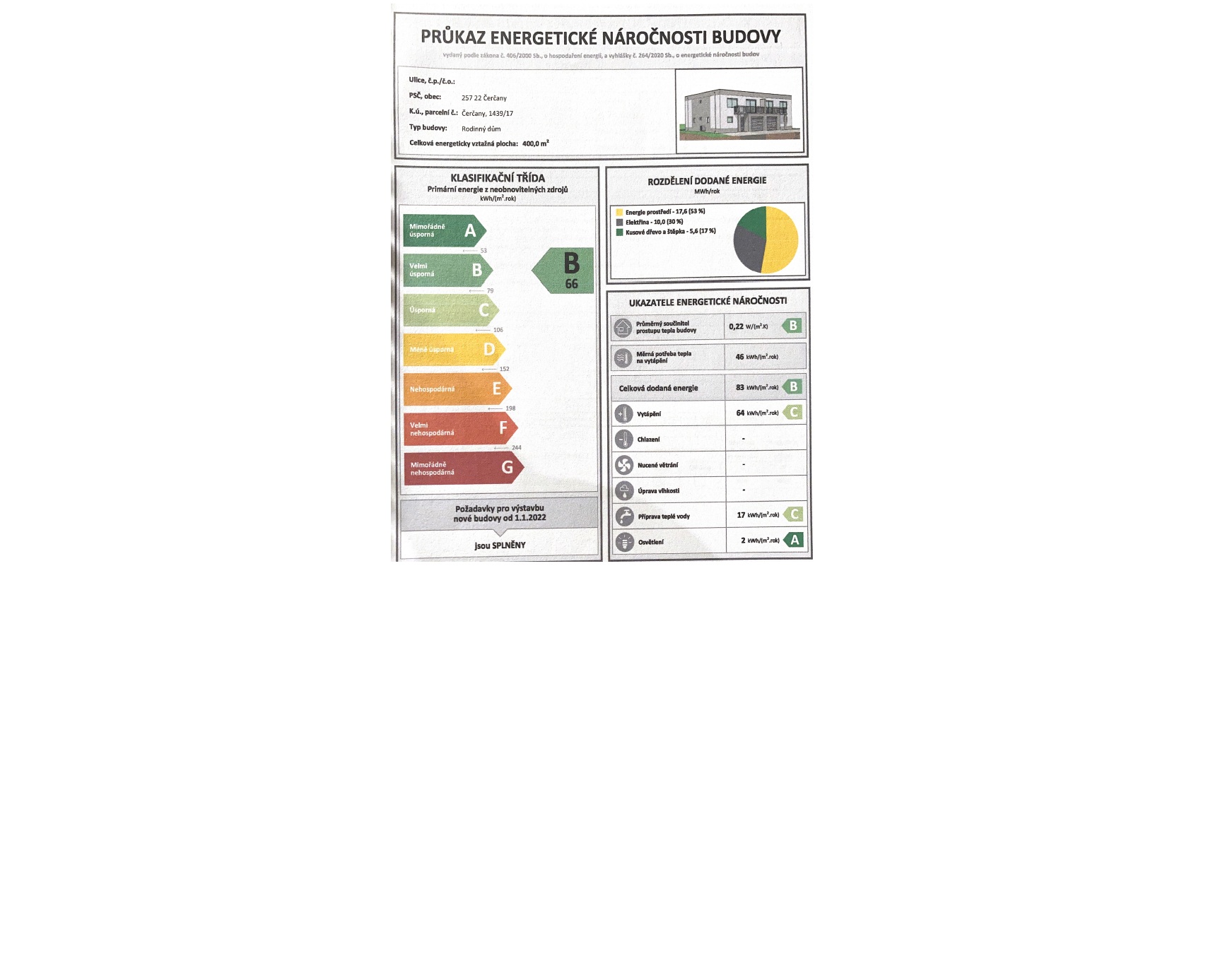 Použité materiály: zdivo Cihla Porotherm 30 cm plus 17 cm zateplení, střecha zateplená 50 cm polystyrenu, okna plastová - trojsklo, vytápění podlahové - zdroj tepelné čerpadlo Panasonic, krbová vložka 9 kw, obecní kanalizace a vodovod, energetická třída B, příprava na před okenní rolety, příprava pro fotovoltaiku, zpevněné plochy okolo domu betonová dlažba 10 cm.